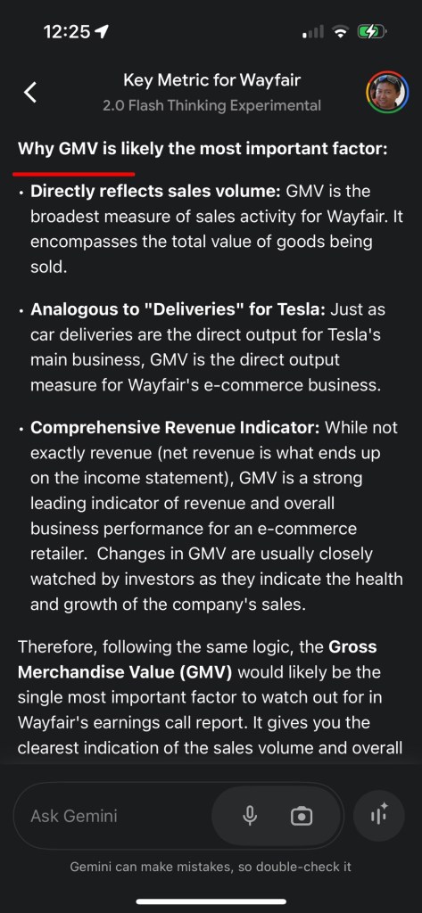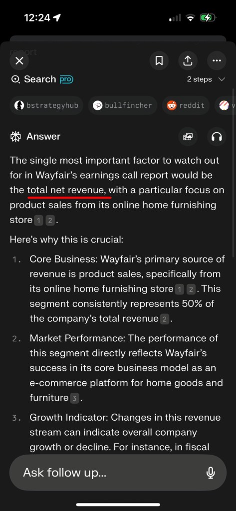 汽车销售收入是特斯拉收入的最大组成部分。因此,我认为每季度财报电话会议中公布的汽车交付数量是投资特斯拉时最重要的关注因素。按照同样的逻辑,在 Wayfair 的财报电话会议中,最重要的关注因素应当是什么?