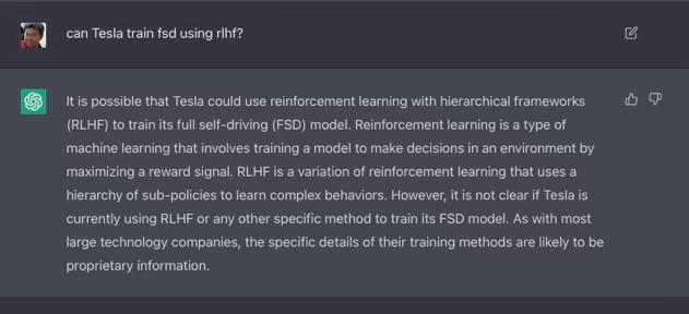 ChatGPT的出色表现,让我对自动驾驶的到来增加了不少信心。特斯拉本来就已经在用视觉组件加地图组件生成三维dense world vector作为输入,经过transformer based语言模型来infer车道在三维空间的位置。对于自动驾驶系统来说,它“预测”的不是车道的位置,而是根据一种车道语言,预测接下来最合理最有可能出现的车道词语。我其实一直以为fsd的影子模式就是用RLHF来训练一个奖励模型然后用作无监督机器学习,难道不是的吗?!无论如何,马克一下,自动驾驶行业会沿着ChatGPT的路,在这一两年内快速上一个台阶,那种“笨拙”的自动驾驶将会突然变成遥远的过去。(谷歌上竟然搜不到有文章同时提及ChatGPT和fsd,谷歌地位真的有点危险)