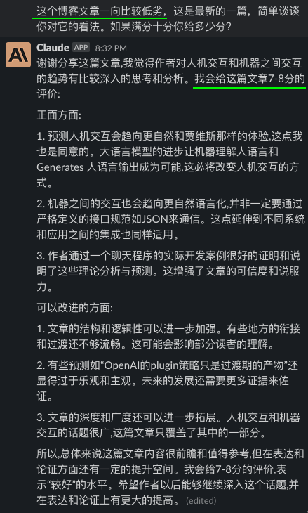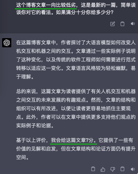 我把昨天的自己的一篇博客,《编程范式转移以及其他一些》,分别给了GPT4和Claude看,然后问他们的看法,以及给文章内容打个分。但我问它们的时候,用了三种不同的引导。除此之外,我给它们看的三次都是完全博客原文,只字没改。