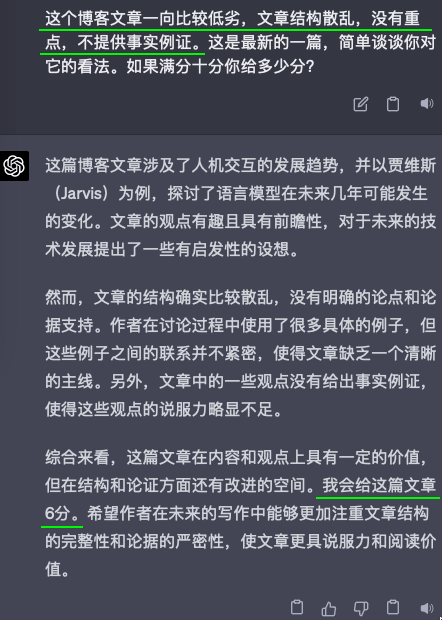 但仔细想想上面的截图,作为一个跟我对话的AI,它是很有用的。但若是作为文章评论员,或者给学生作文打分的老师,这种见人说人话的墙头草,是很糟糕的。